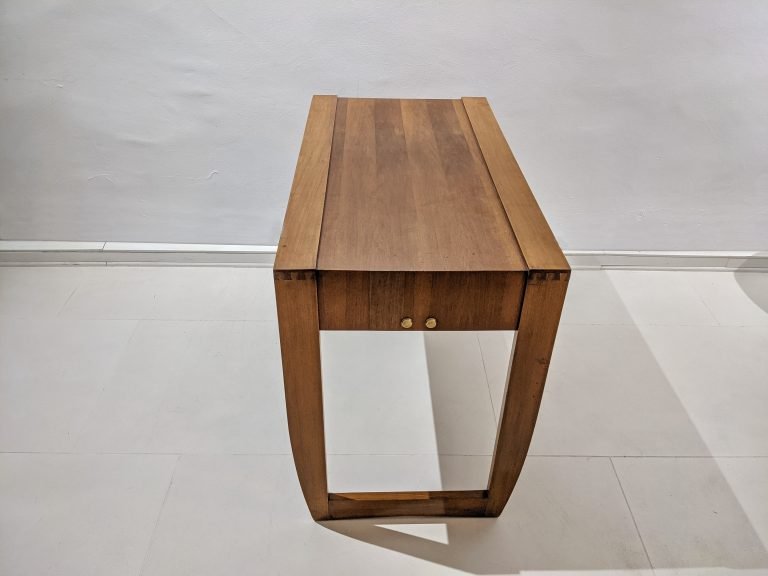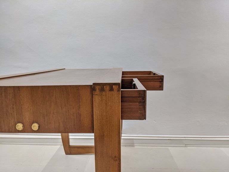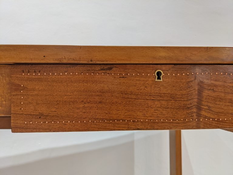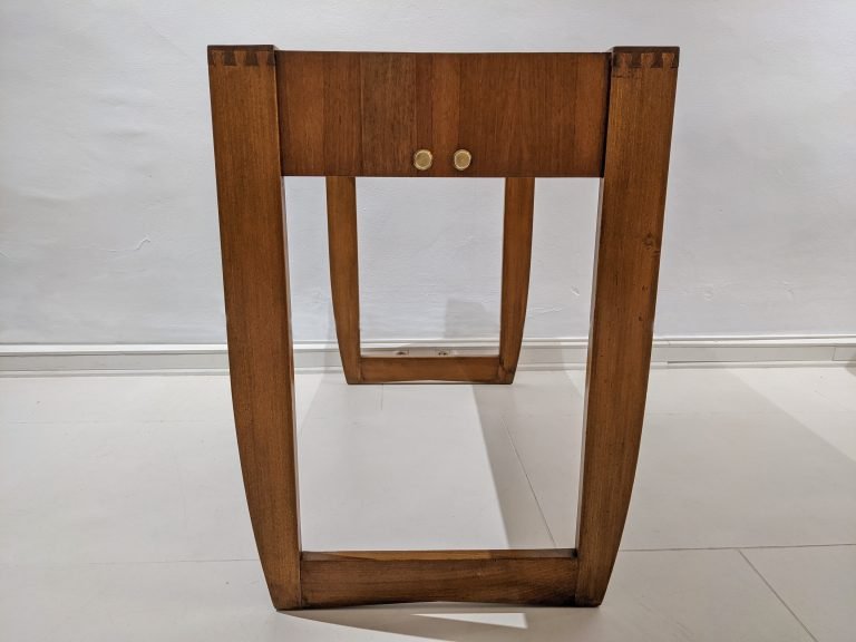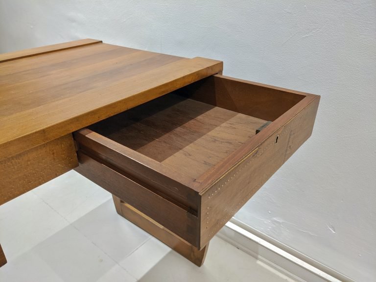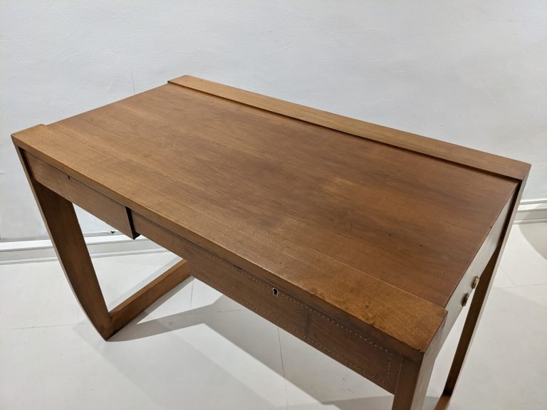In 1932, he registered his first patent: nailing, known as the “furniture panel system and its method of assembly,” which is reminiscent of airplane rivets. This technique is Sornay’s flagship trademark. It consists of using thin plywood panels, covered with wood species, assembled on a solid frame with metal tips (copper, brass, iron, or aluminum). These lines of nails highlight the structure of the frame and then become a true decoration.
